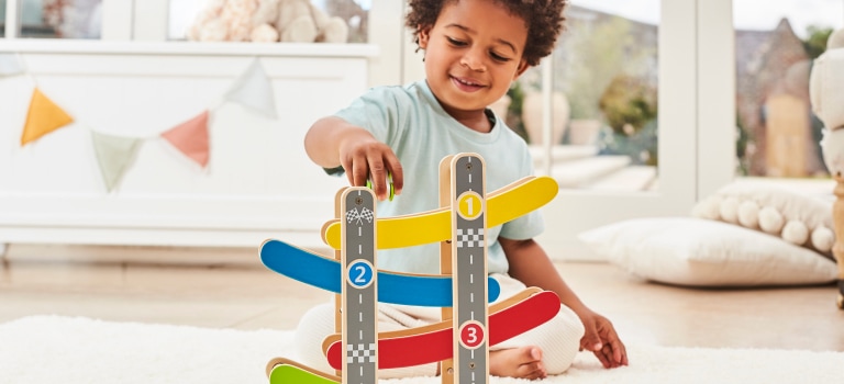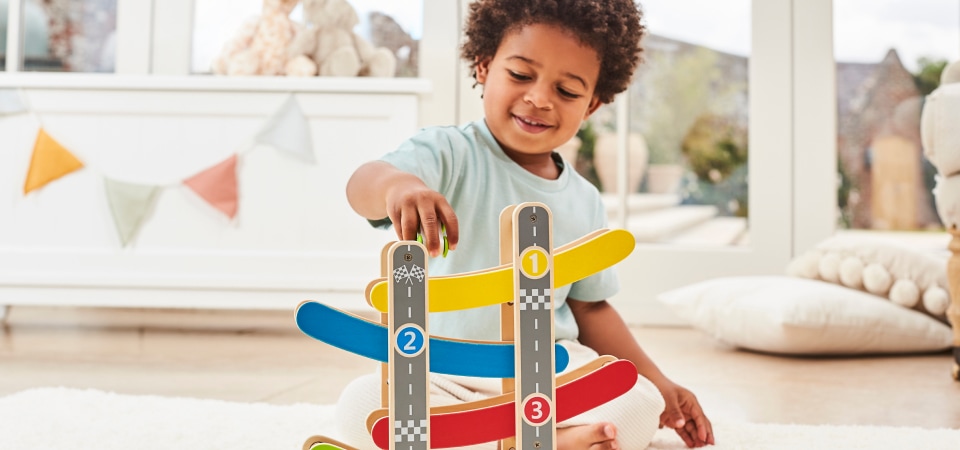 Mithilfe der Xylophon-Schiene kannst du spielend leicht mit deiner Quadrilla- Bahn Melodien erzeugen. Sie spielt eine Tonleiter, wenn die Murmeln darüber rollen.
