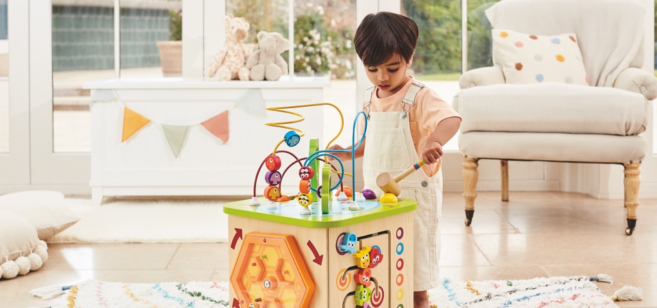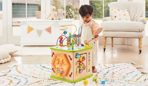 Mit der Regenbogen-Bank können kleine Baumeister Hämmern wie die Großen. Die Klopfbank aus Holz verfügt über Pflöcke in Regenbogenfarben, die sich ganz einfach durch die Löcher schlagen lassen.