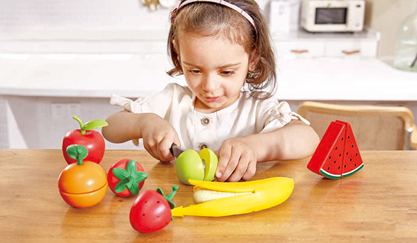 Mit dem Obst-Set wird gesunde Ernährung zum Kinderspiel. Es enthält jede Menge Früchte, die mit dem realistischen Spielmesser in Scheiben geschnitten werden können.