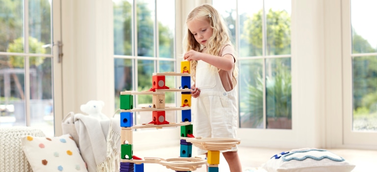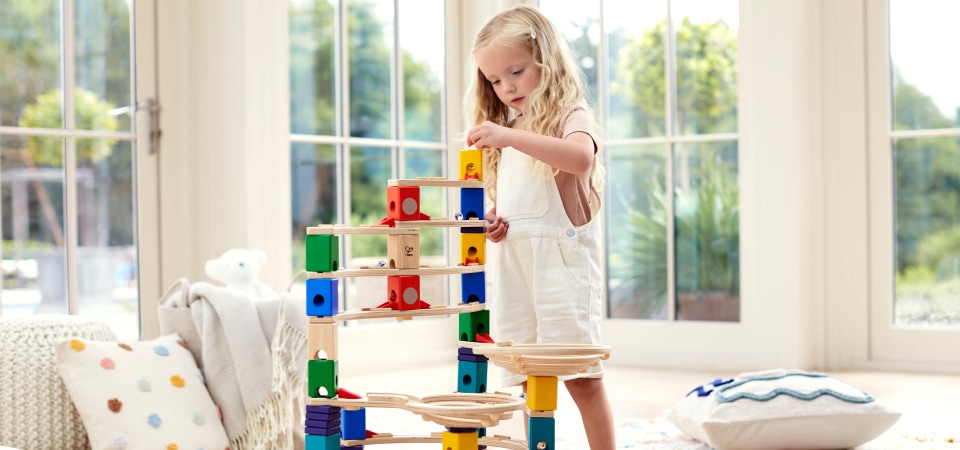 Durch die Rinnen an den farbigen Blöcken brauchen deine Murmeln länger, um den Weg durch die Quadrilla zu finden. Sieht nicht nur toll aus, sondern zeigt auch neue Wege, um die Murmel zum Ziel zu befördern.