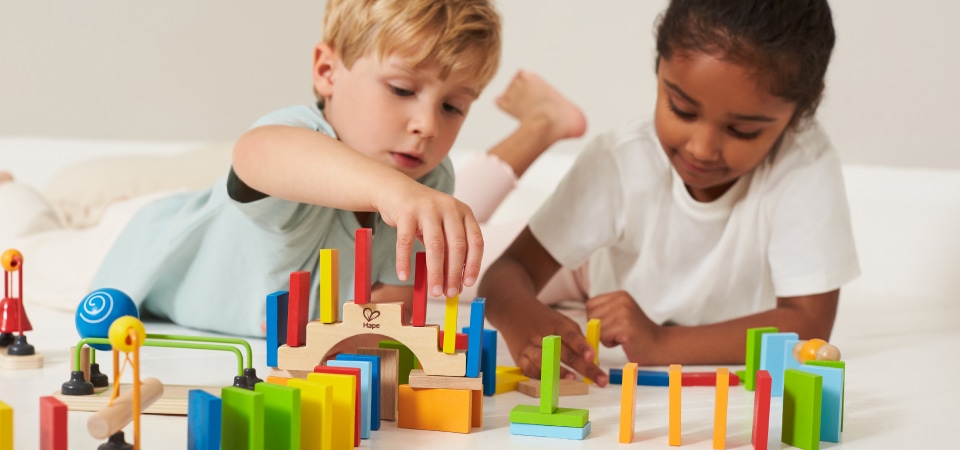 Hier sind deiner Fantasie keine Grenzen gesetzt. Bau deinen persönlichen Domino-Parcours mit 100 bunten Holzteilen. Integriere unter anderem eine Brücke und eine Glocke. Und am Ende? Reicht ein kleiner Anschubser und alle Steine fallen mit großem Tamtam nach und nach um.