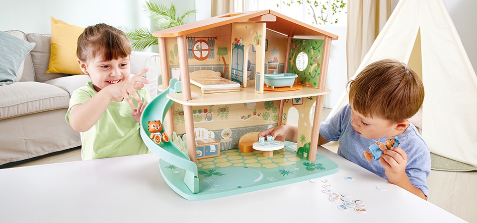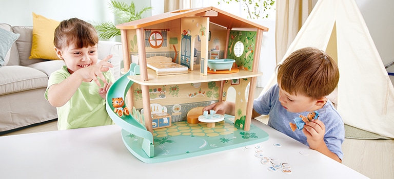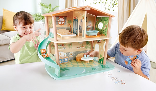 Das zweistöckige Urwaldhaus aus der Reihe Green Planet Explorers ist aus nachhaltigem Bambus und anderen umweltfreundlichen Materialien gefertigt. Damit lernen kleine Umweltschützer alles über Recycling. Es enthält eine Vielzahl von Einzelteilen wie ein Bett und ein Badezimmer sowie 18 Müllkarten, mit denen der Müll in die korrekten Recycling-Öffnungen entsorgt werden muss. Die Kinder verbringen mit den beiden Tigern unzählige Stunden mit der Erforschung des Urwalds. Das bringt garantiert jede Menge Spaß. Ganz nebenbei lernen die Kinder auch einiges über die Bedeutung von Nachhaltigkeit, während sie mit ihren Tigerfreunden zahllose Abenteuer erleben. Außerdem entwickeln die Kinder ihre Feinmotorik, Fantasie und Kreativität und vor allem ihr Wissen über Nachhaltigkeit.